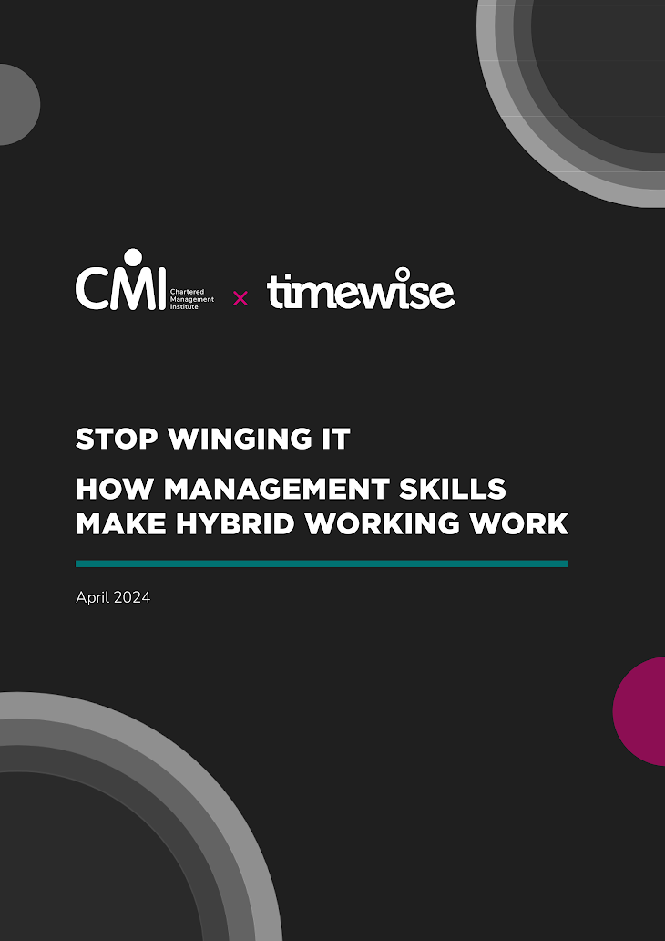 Making Hybrid Work for you and your Team Managers can face challenges when implementing effective hybrid working. CMI partnered with Timewise to conduct research, delving into hybrid working dynamics. The research highlights the crucial role that management skills play in overcoming the obstacles to making hybrid work and the impact of targeted training. Explore the findings In partnership with Management Skills for Hybrid Working Since the COVID-19 pandemic, hybrid working has become widespread. According to a CMI poll, the majority of managers (83%) are in favour of hybrid working. Yet, many organisations have adopted a reactive approach. They have relied on the outdated practices picked up during the pandemic, limiting their productivity in the process. Given this context, we undertook a project where training workshops were delivered by Timewise to a small community of managers and we evaluated the impact. The report ‘How Management Skills Make Hybrid Working Work’ explores ways managers can get the best out of their team when working in a hybrid way. Read the full reportExplore key findings *Managers Voice poll of 1,006 managers conducted between 18th and 25th May 2023 Key Findings After completing the targeted training, managers noted significant improvements in their ability to manage hybrid teams. They demonstrate greater confidence in the following key areas. Comparison of before and after training figures: Resolving conflicts Keeping teams motivated Balancing work & home commitments Managing underperformance Explore key findings Key Recommendations The report highlights the key skills that managers should demonstrate to make hybrid working effective. Listening: Set expectations and respond to people’s personal needs. Self-awareness: Examine how your management competencies will impact the team. Communication: Develop strategies for positive reinforcement and information sharing. Inclusivity: Address hidden biases to engage all team members. Transparency: Make sure you share relevant processes and involve others. Meticulousness: Share key points from relevant meetings with your team. Connections: Create cohesion and build in regular contact. Assertiveness: Proactively create a safe space in virtual meetings. Designing and using hybrid meetings effectively: Consider whether a virtual or in-person meeting is appropriate. Utilise different remote working tools: Mix different communication methods such as real time chat and virtual meetings. I’m being more intentional in my approach to the way my team works and more aware about the impact hybrid working has on equity, diversity and inclusion, team cohesion, and my role as a manager. Line manager of a large organisation, working in the public sector Find out more If you want to find out more about the hybrid training course or to participate in future research, please reach out to the team. Speak to the team